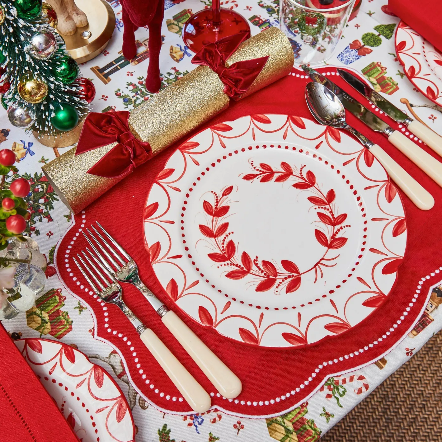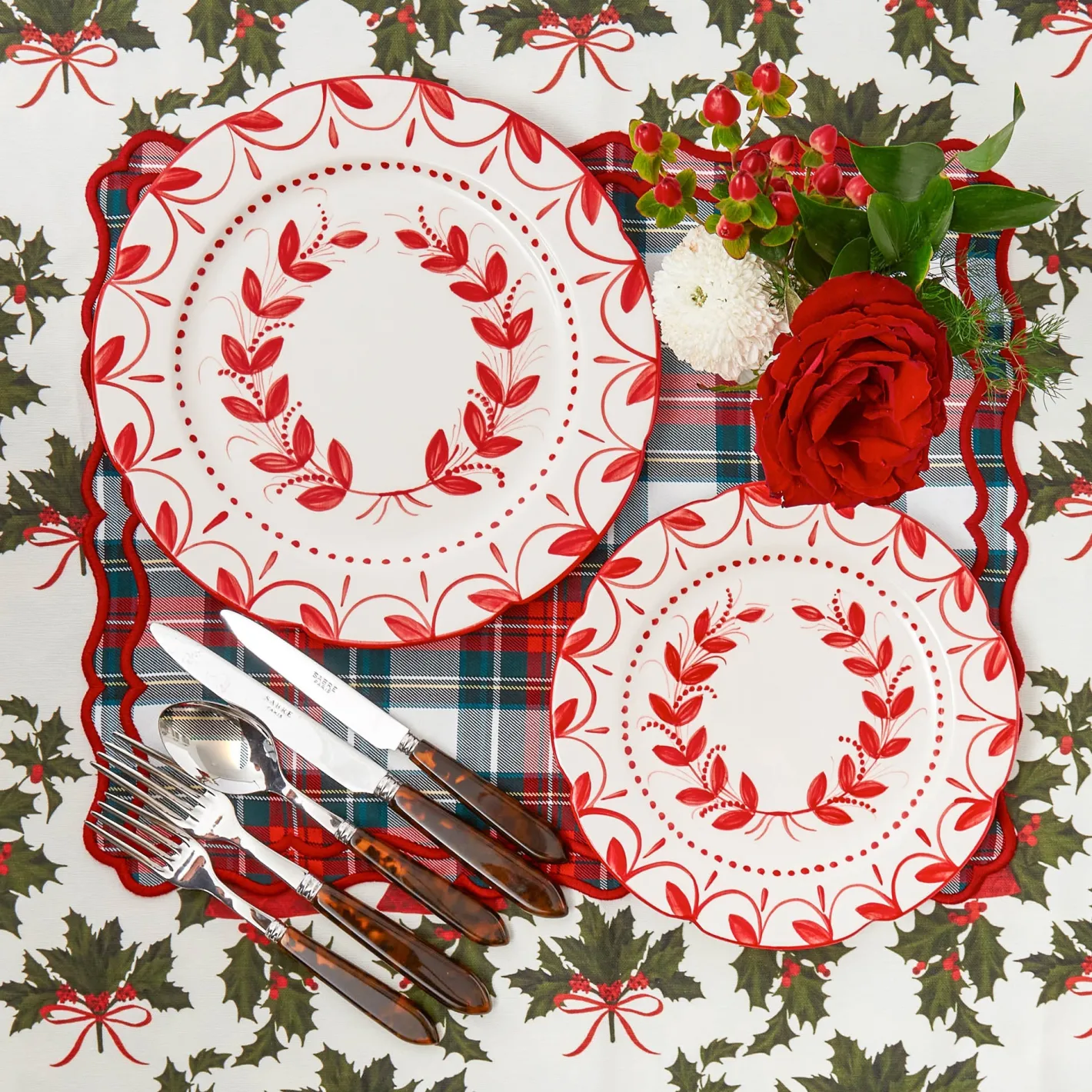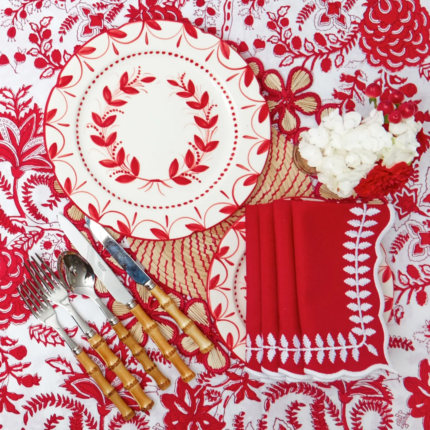 Create the ultimate Christmas table by styling with our Red Elizabeth Garland Starter Plates, Beatrice Tablecloth and Red Laurel Napkins.