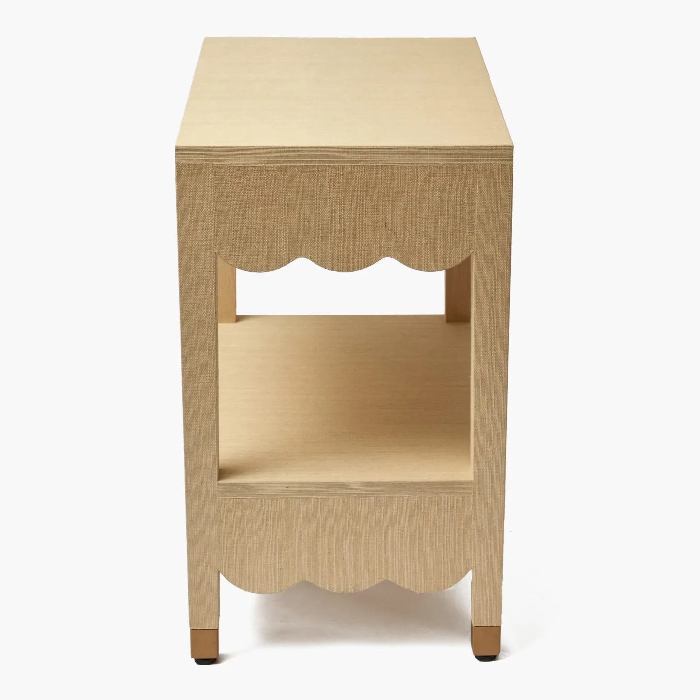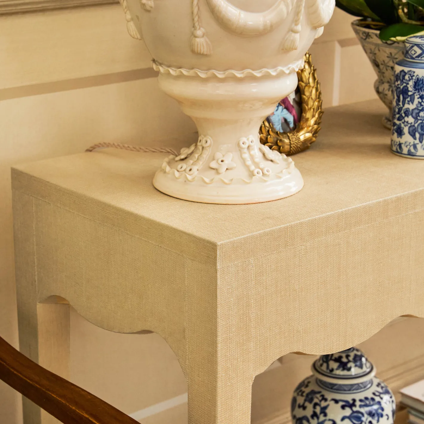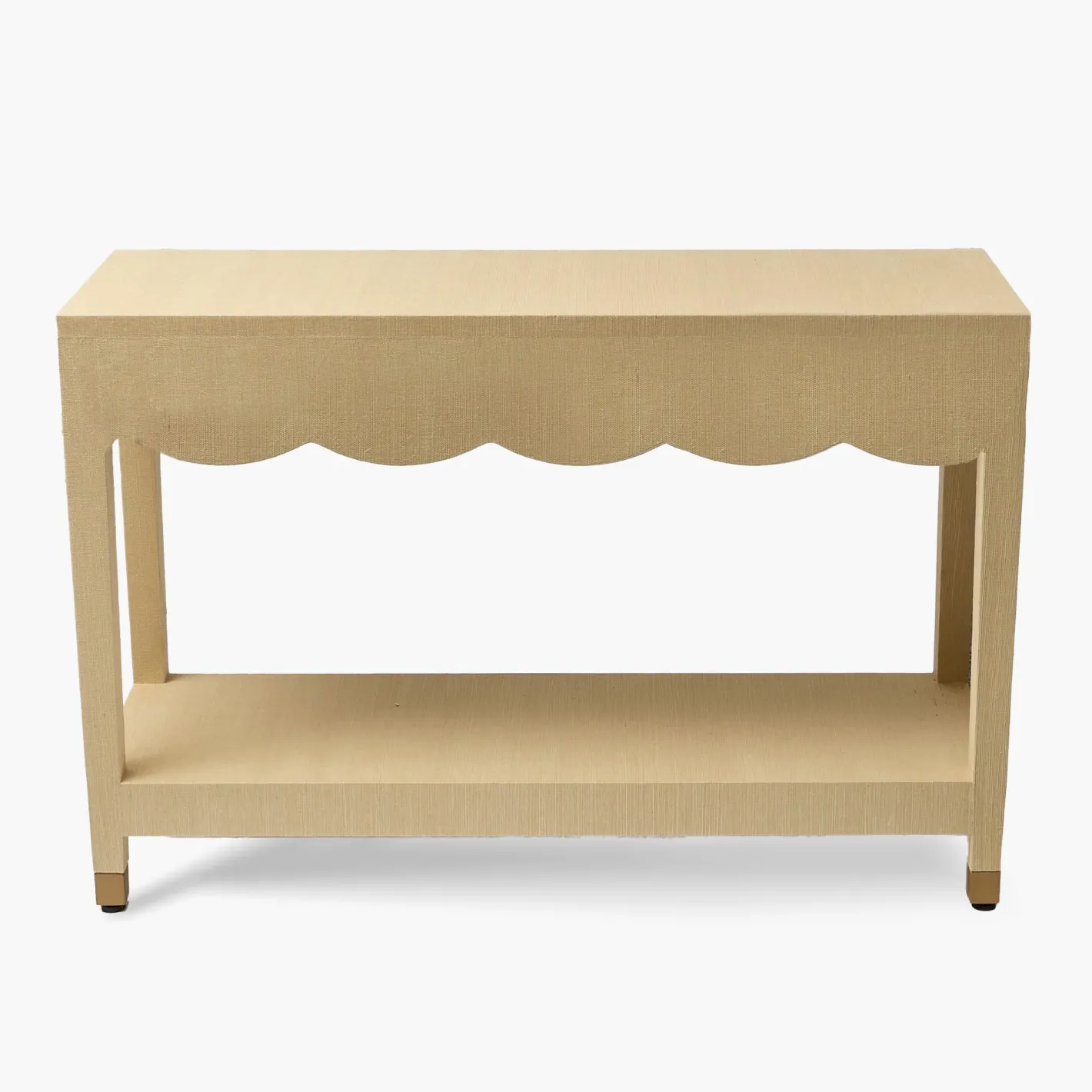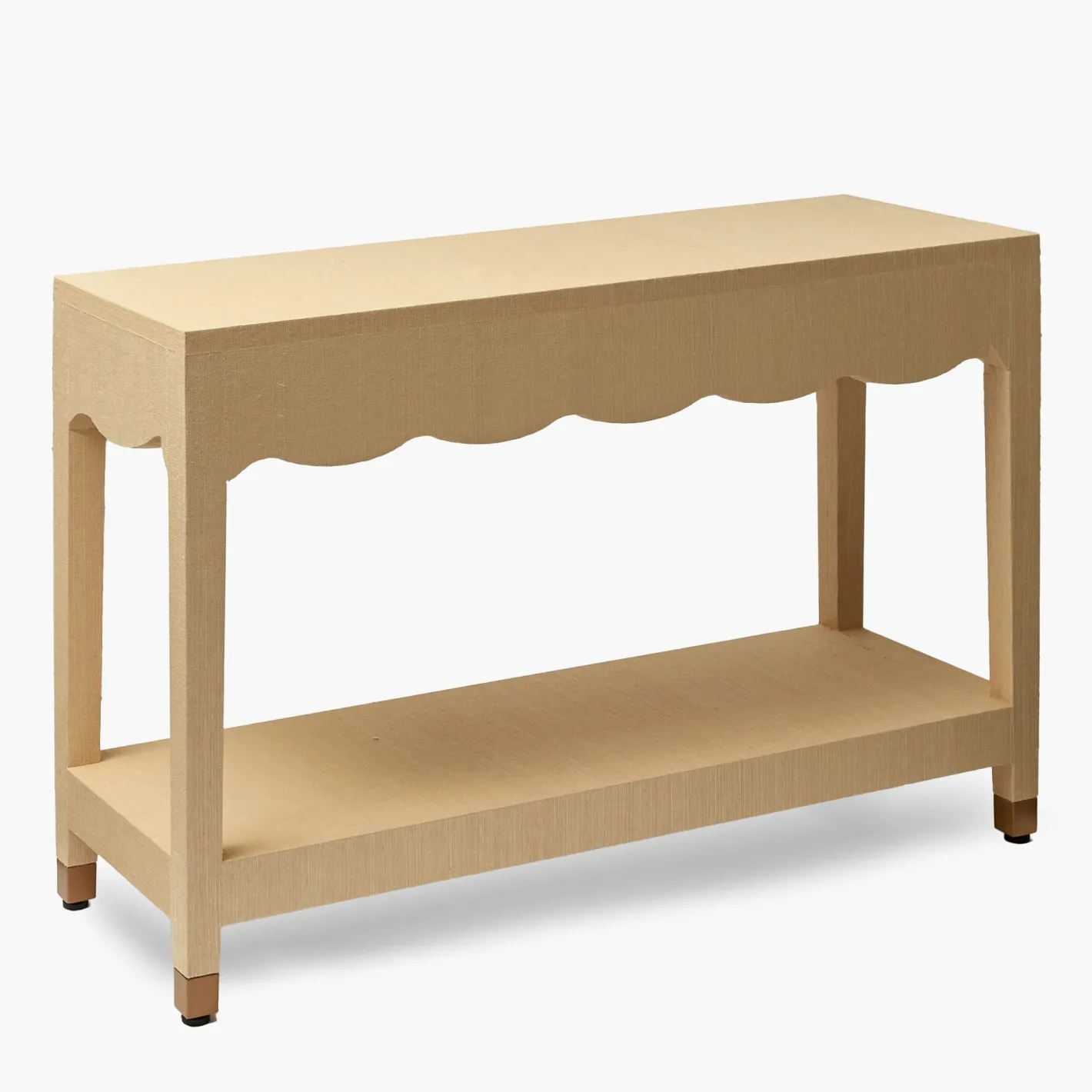 Indulge in understated elegance with our Gwendolyn Grasscloth Console Table. This beautifully texture grasscloth table features a two-tier design and a stunning scalloped trim. Its versatile style makes it perfect for adding sophistication to entryways and living spaces.