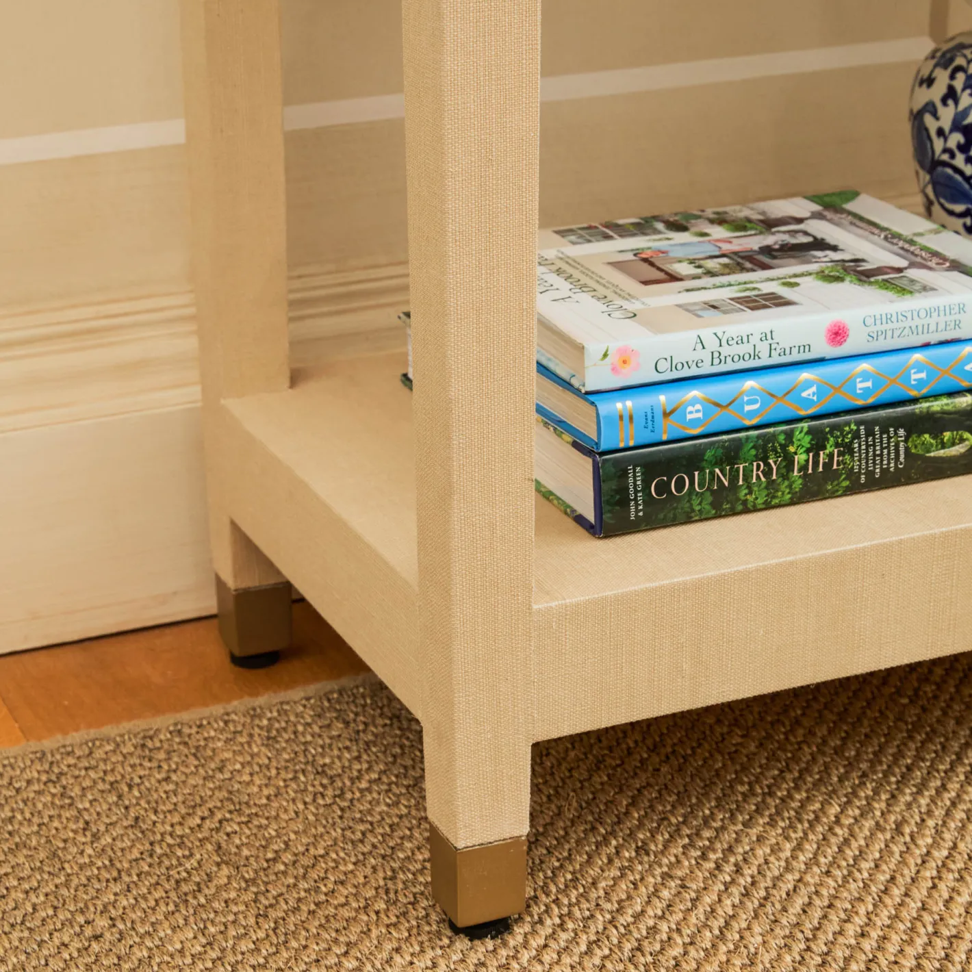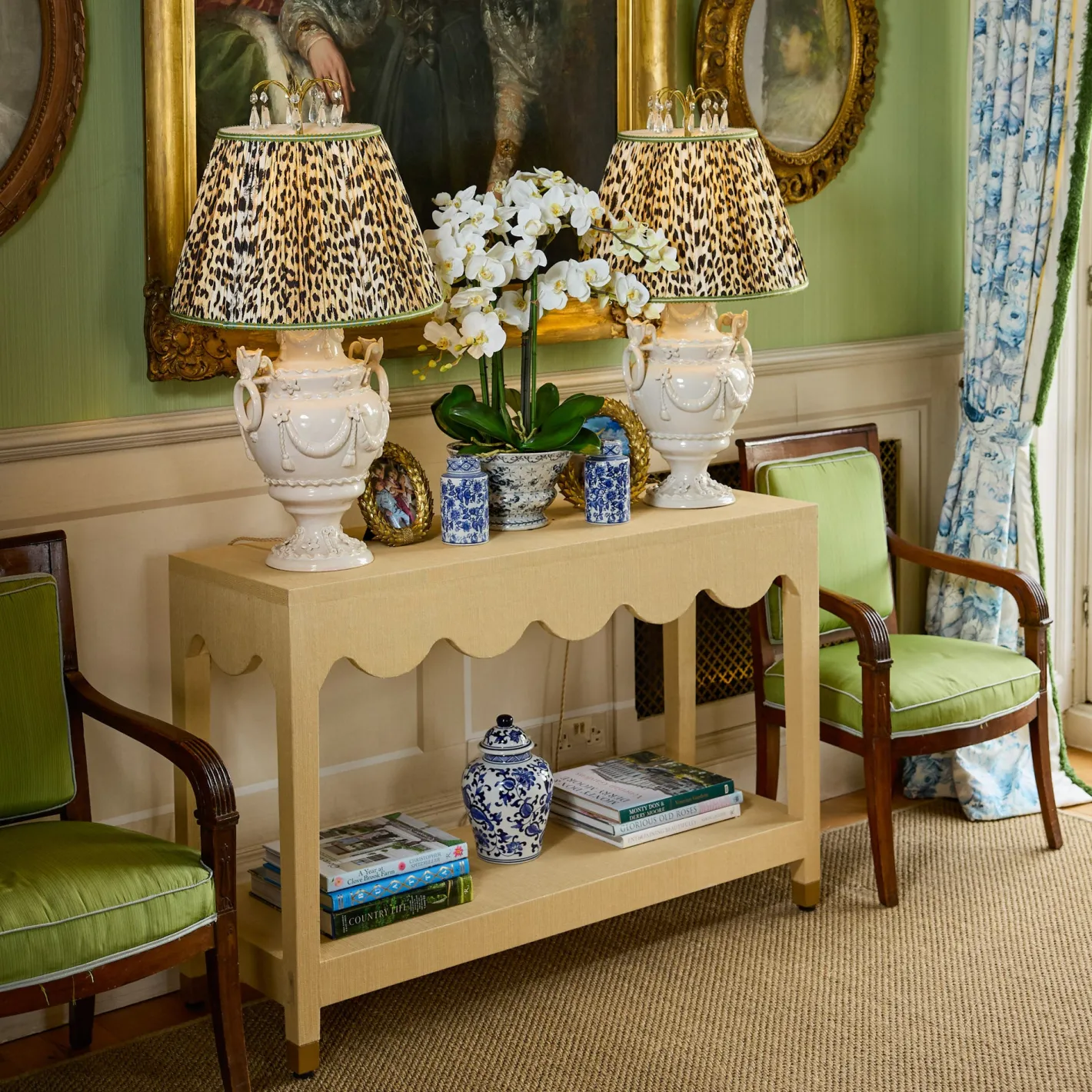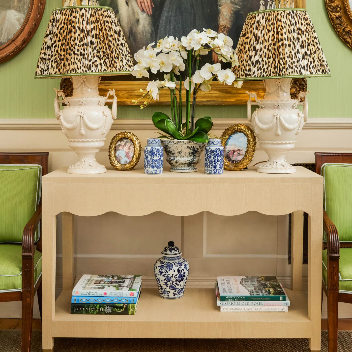 Our beautiful Gwendolyn Grasscloth Console Table is made to order with an estimated delivery date shown above.