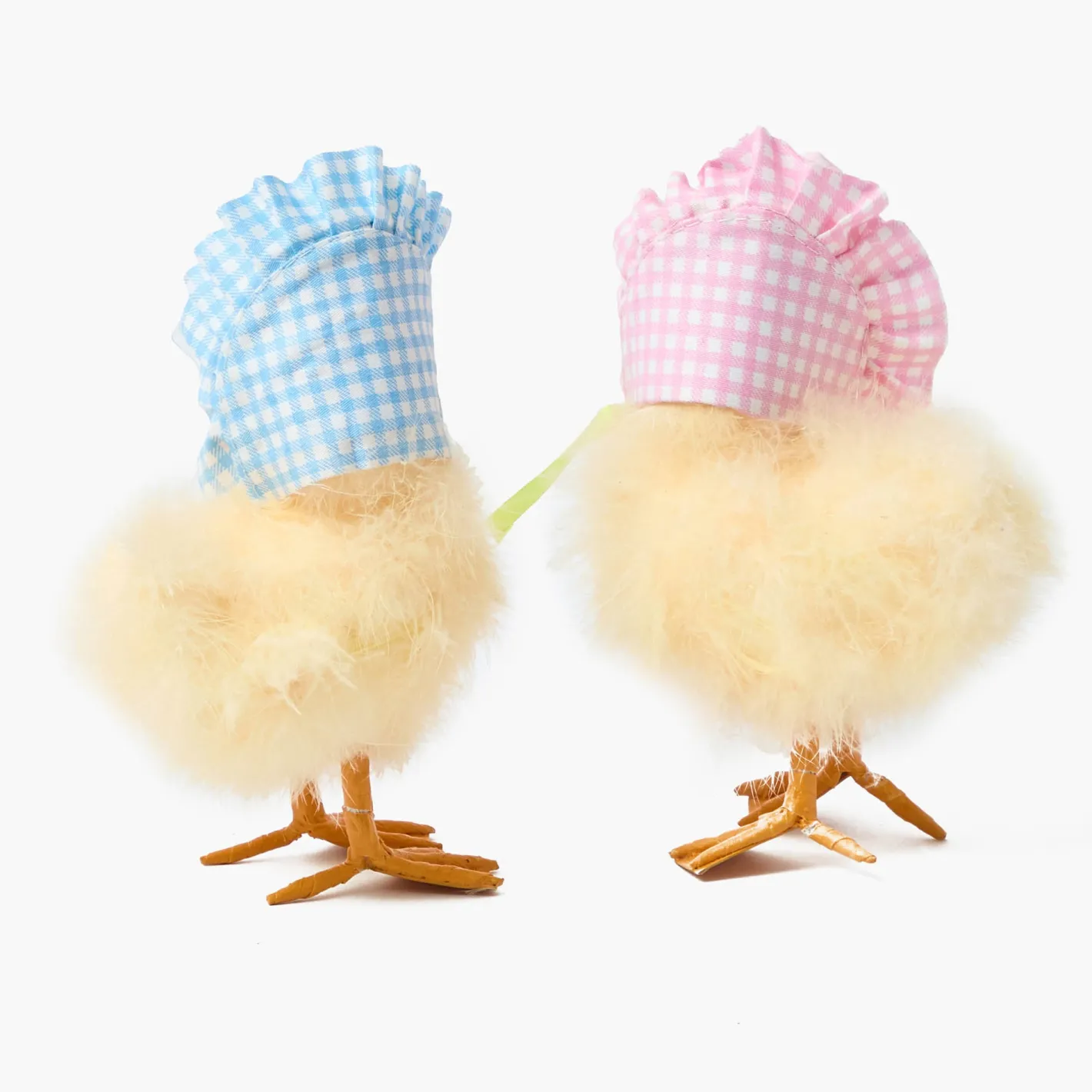 Indulge in the adorable with our Little Miss Bonnets. These two fluffy, yellow little chicks come dressed to impress in their little gingham bonnets. One wears a pink bonnet, while the other is in blue but both look perfectly playful when styled together.