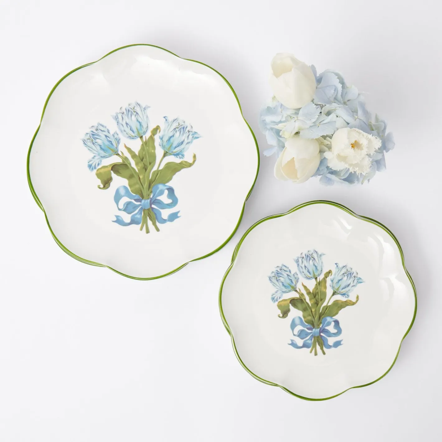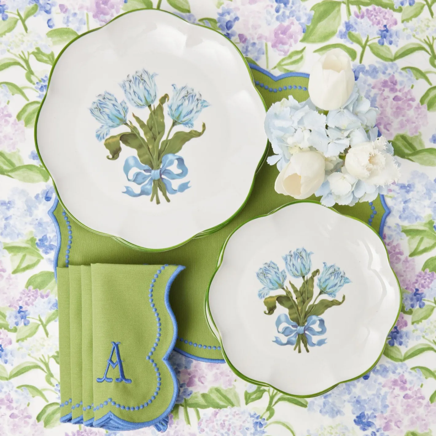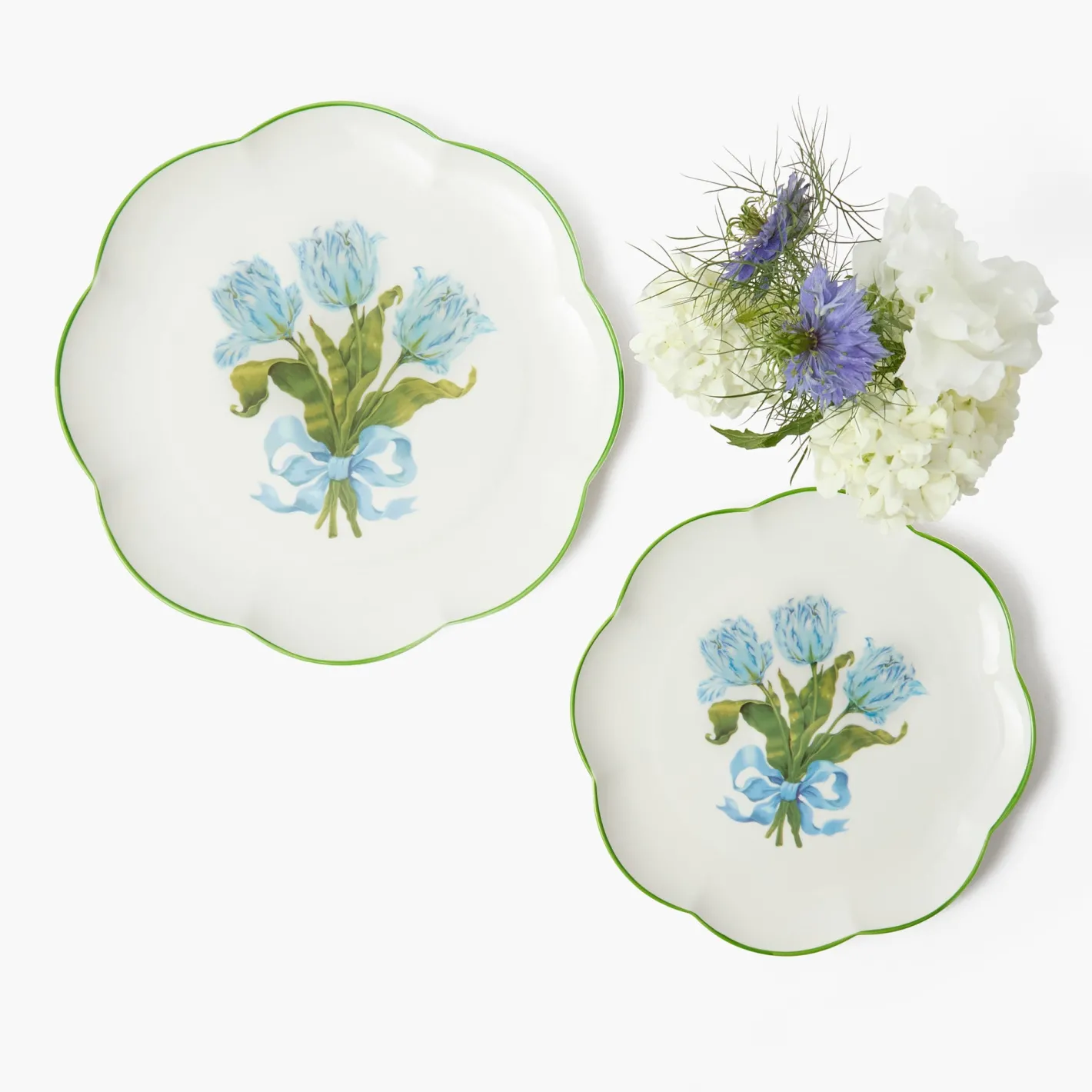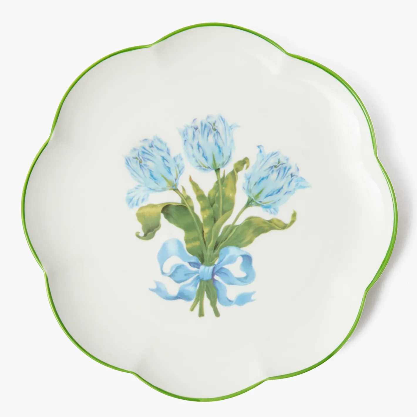 This elegant Starter Plate with its hand-painted green scalloped rim features a beautiful blue tulip bouquet and a ribboned bow.