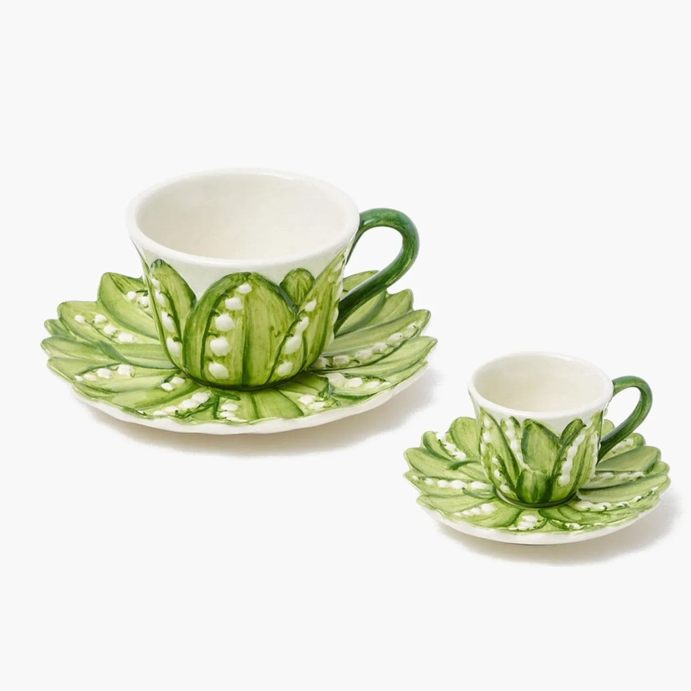 Our small green and white Espresso Cup & Saucer comes with a unique hand-painted Lily Of The Valley design.