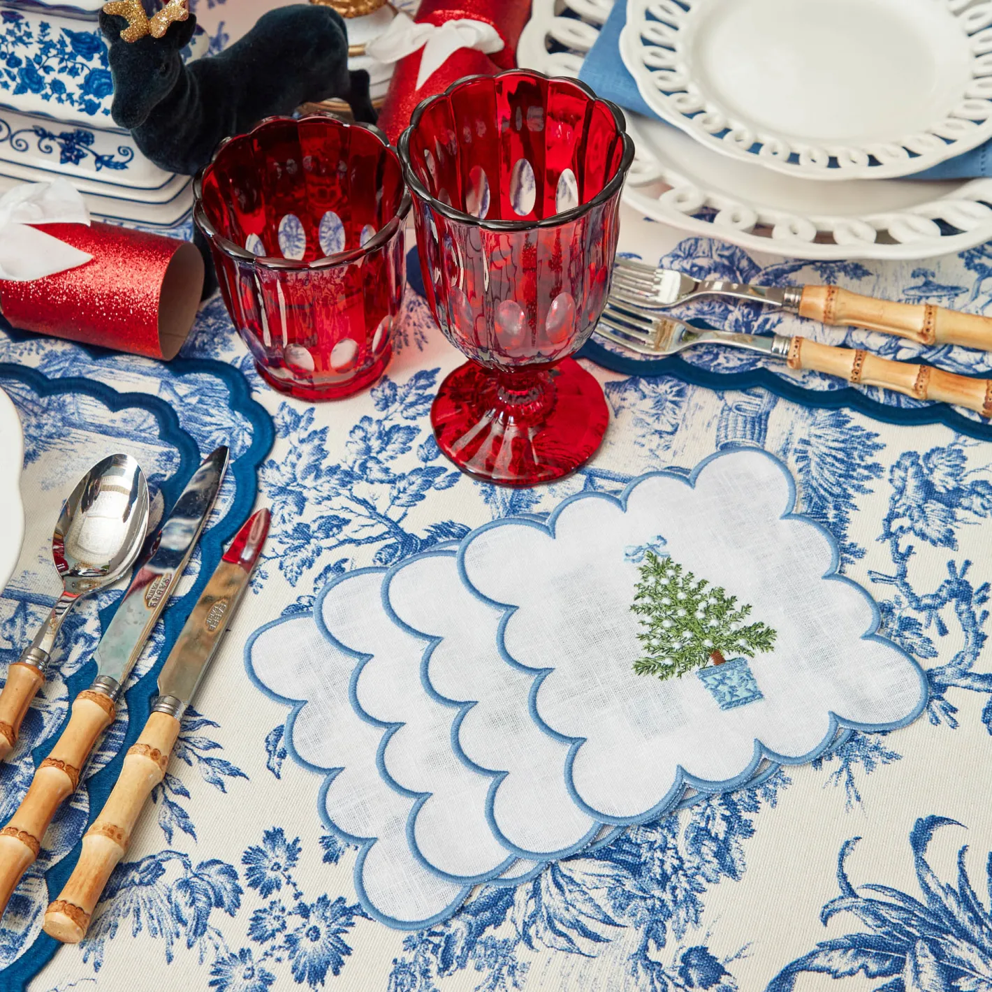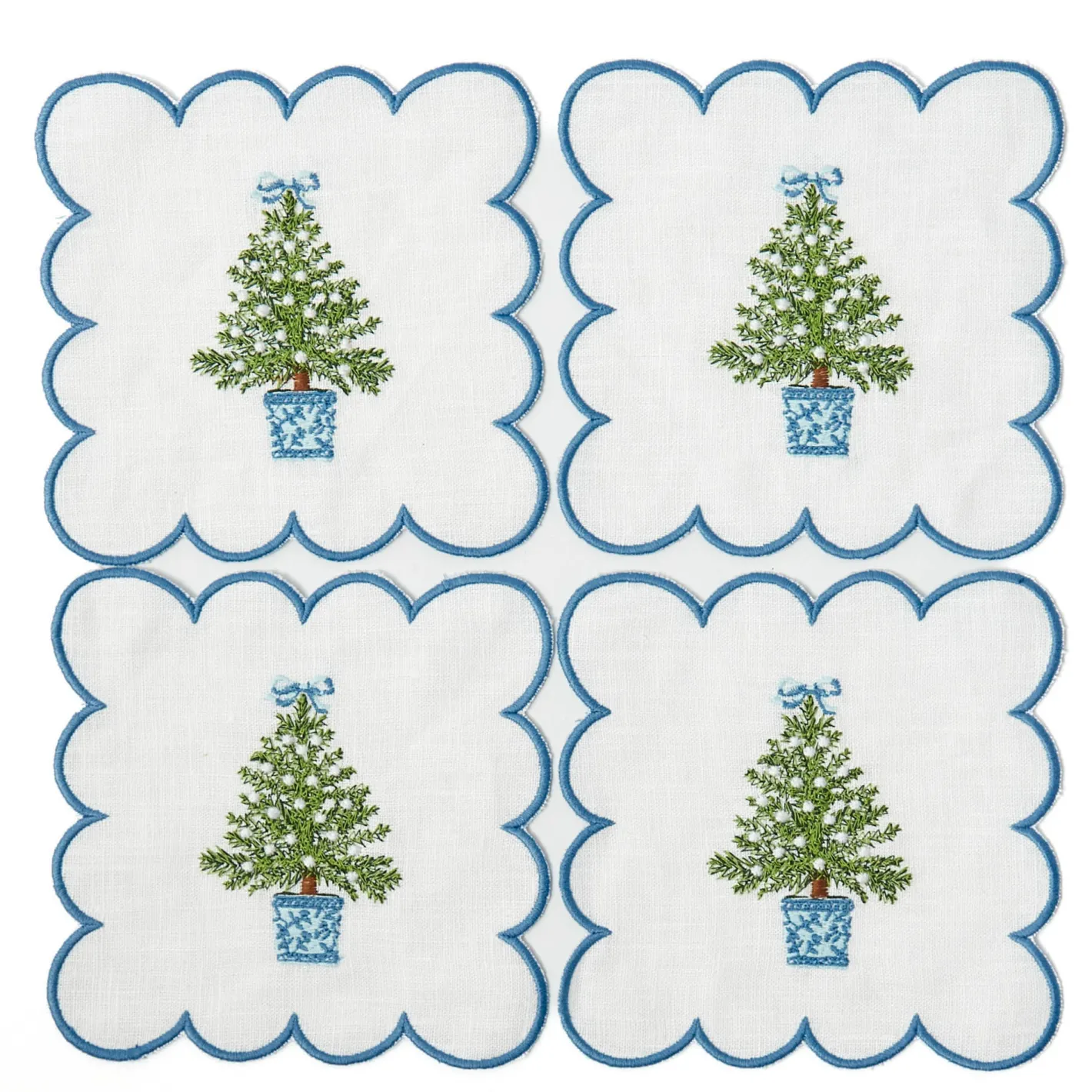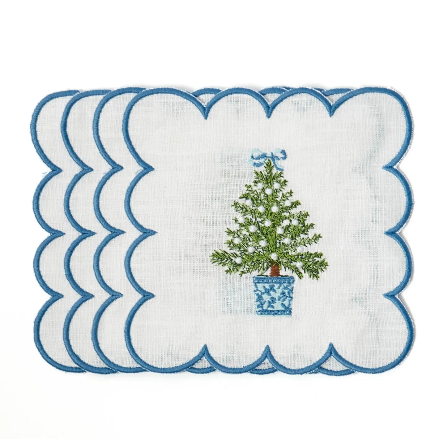 Our Scalloped Christmas Tree Cocktail Napkins will bring a decorative touch to your holiday celebrations. Crafted from pure linen, these four pieces feature a delightful blue scalloped border and an elegant tree at the centre.