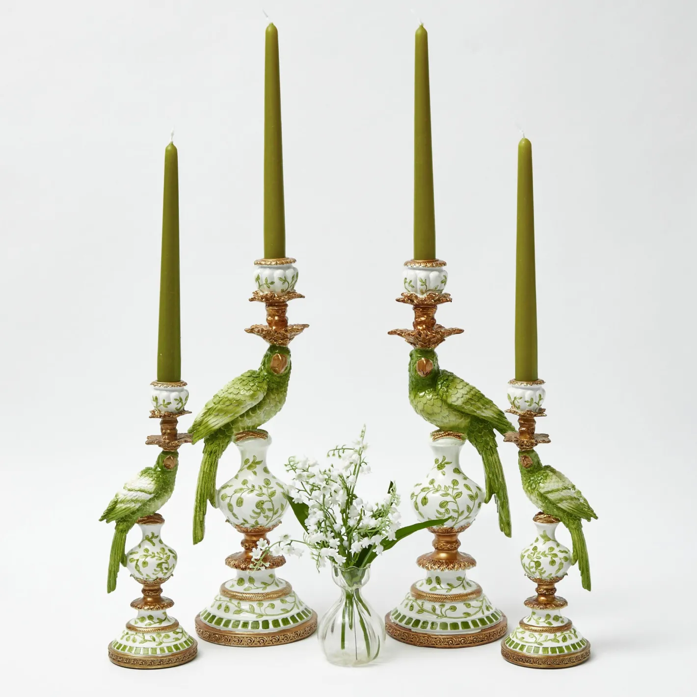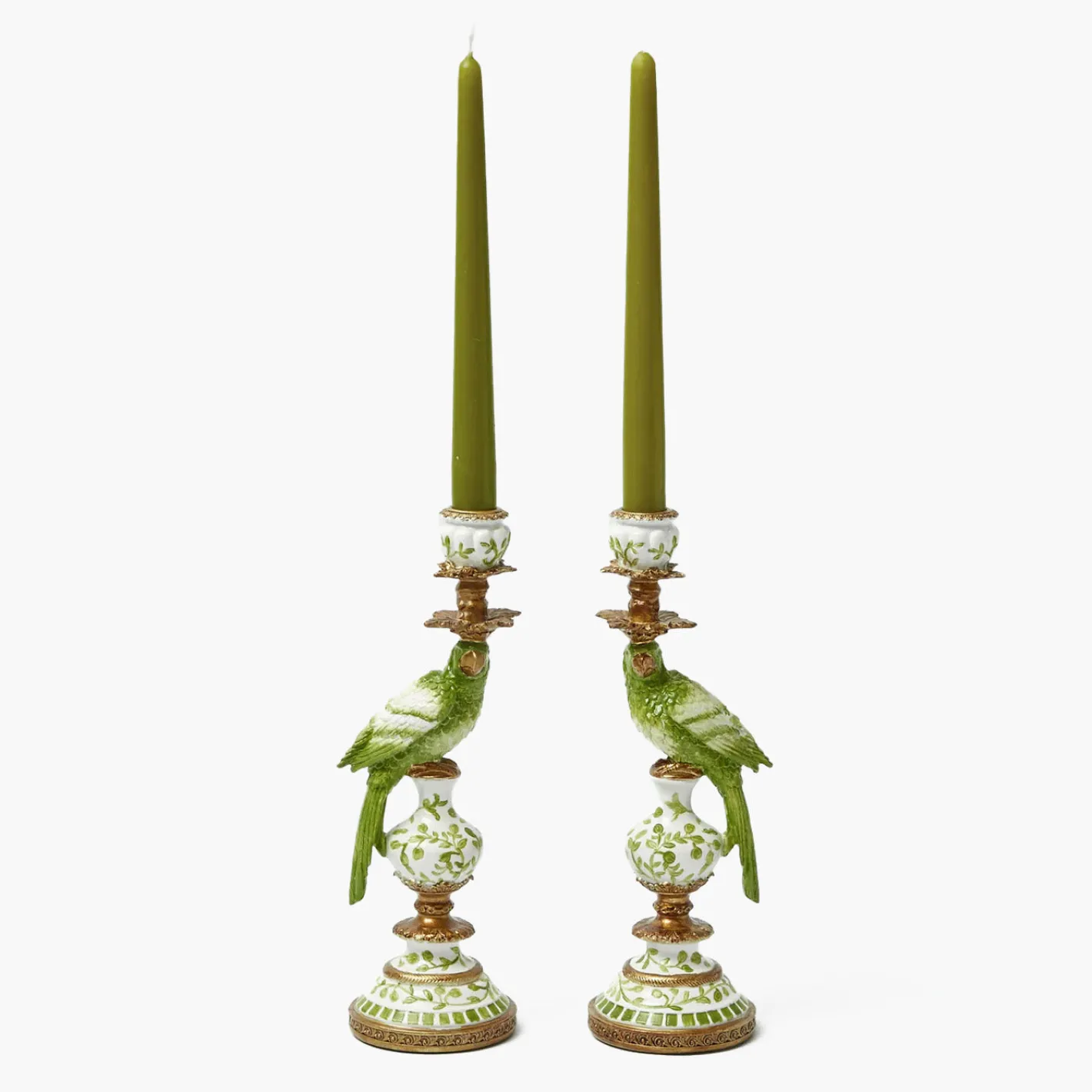 This Pair of Small Green Parrot Candle Holders add height and elegance to any room. These proud birds face each other and give a beautiful symmetry to any table. Use this pair with our Green Candles for the desired effect.