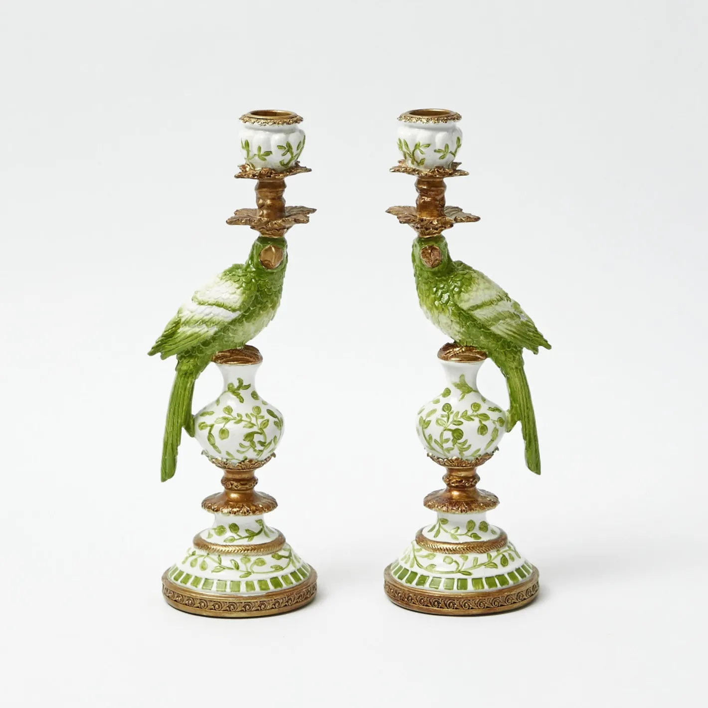 This Pair of Small Green Parrot Candle Holders add height and elegance to any room. These proud birds face each other an…