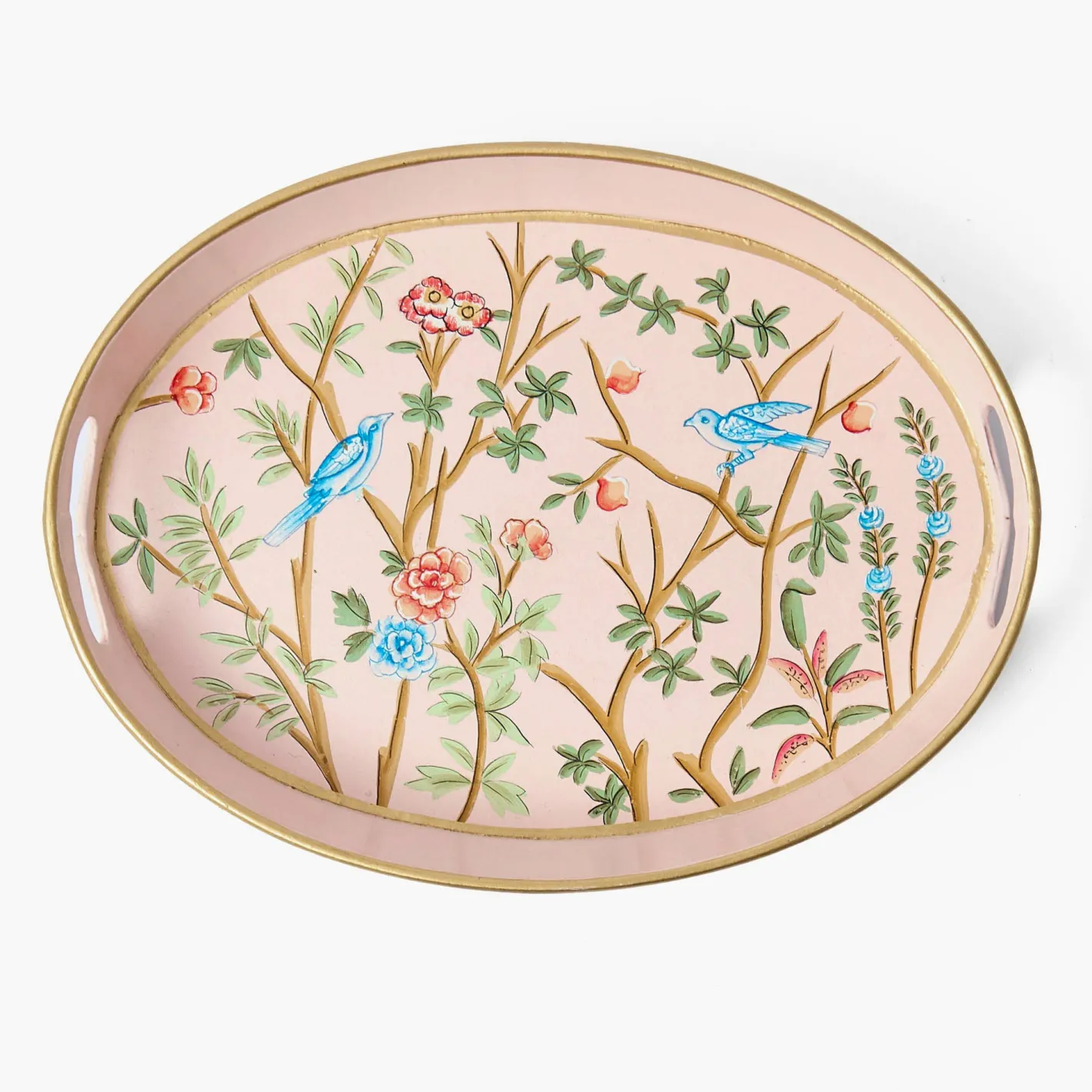 Our Small Pink Oval Chinoiserie Tole Tray seamlessly blends timeless style with intricate design. At the heart of this piece is an elegant floral pattern that will help elevate any room with its refined beauty.